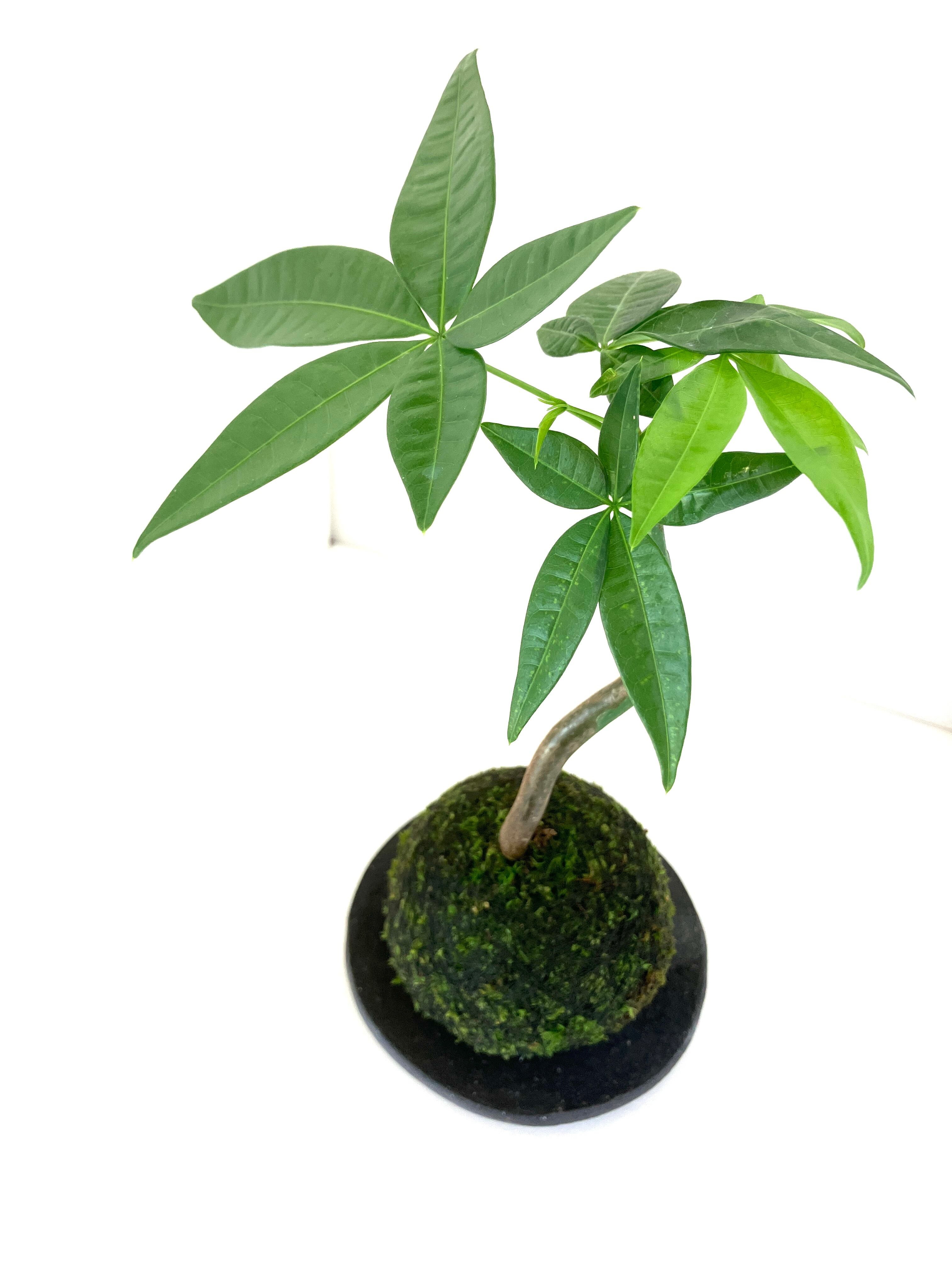 緑の苔が球形の土台を包み込み、パキラの力強く広がる葉が空間に自然のエネルギーをもたらします。