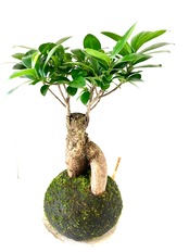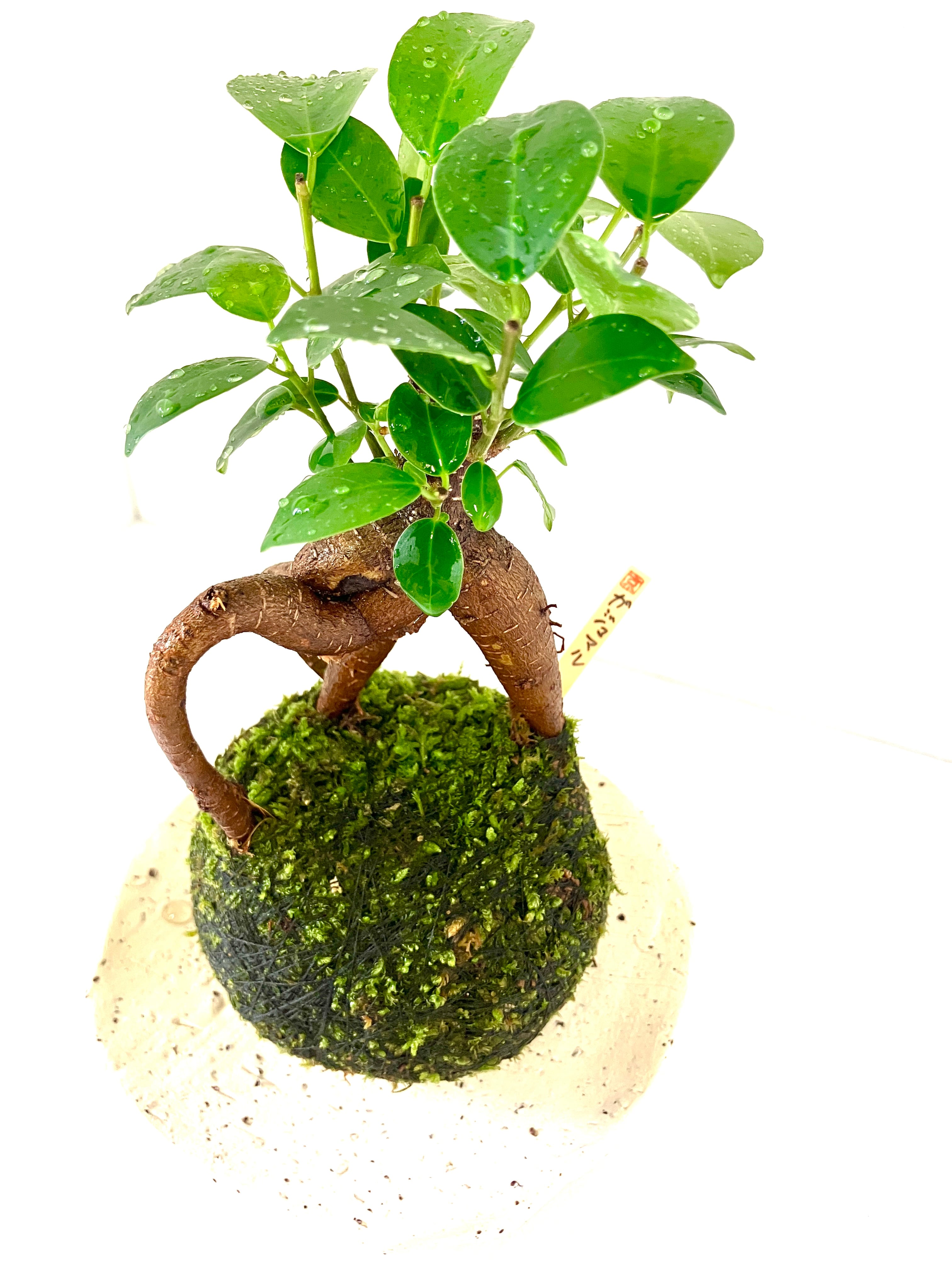 緑の苔が球形の土台を覆い、ガジュマルの丸みのある葉や幹の存在感を引き立てるデザインになっています。