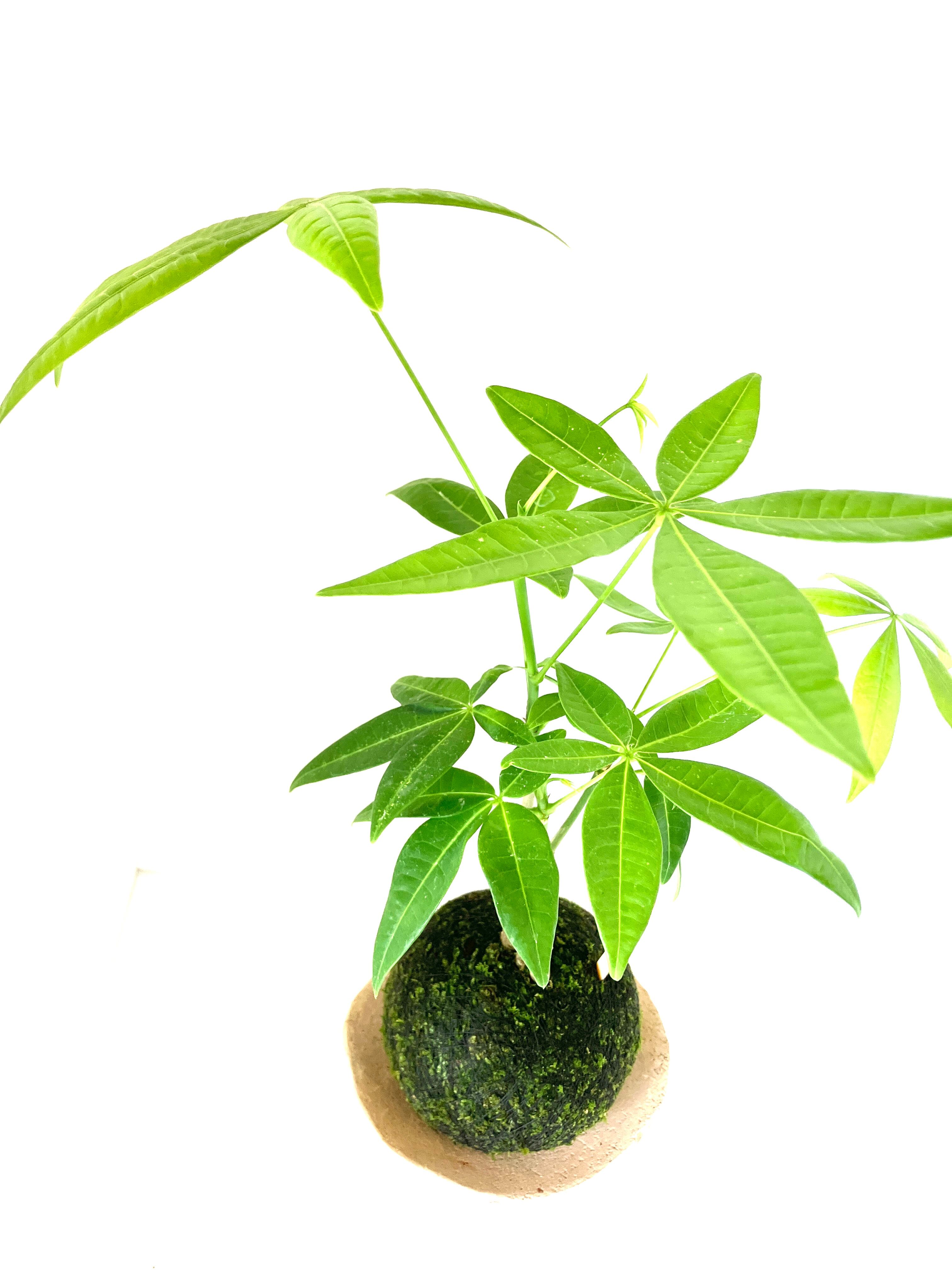 緑の苔が球形の土台を包み込み、パキラの力強く広がる葉が空間に自然のエネルギーをもたらします。