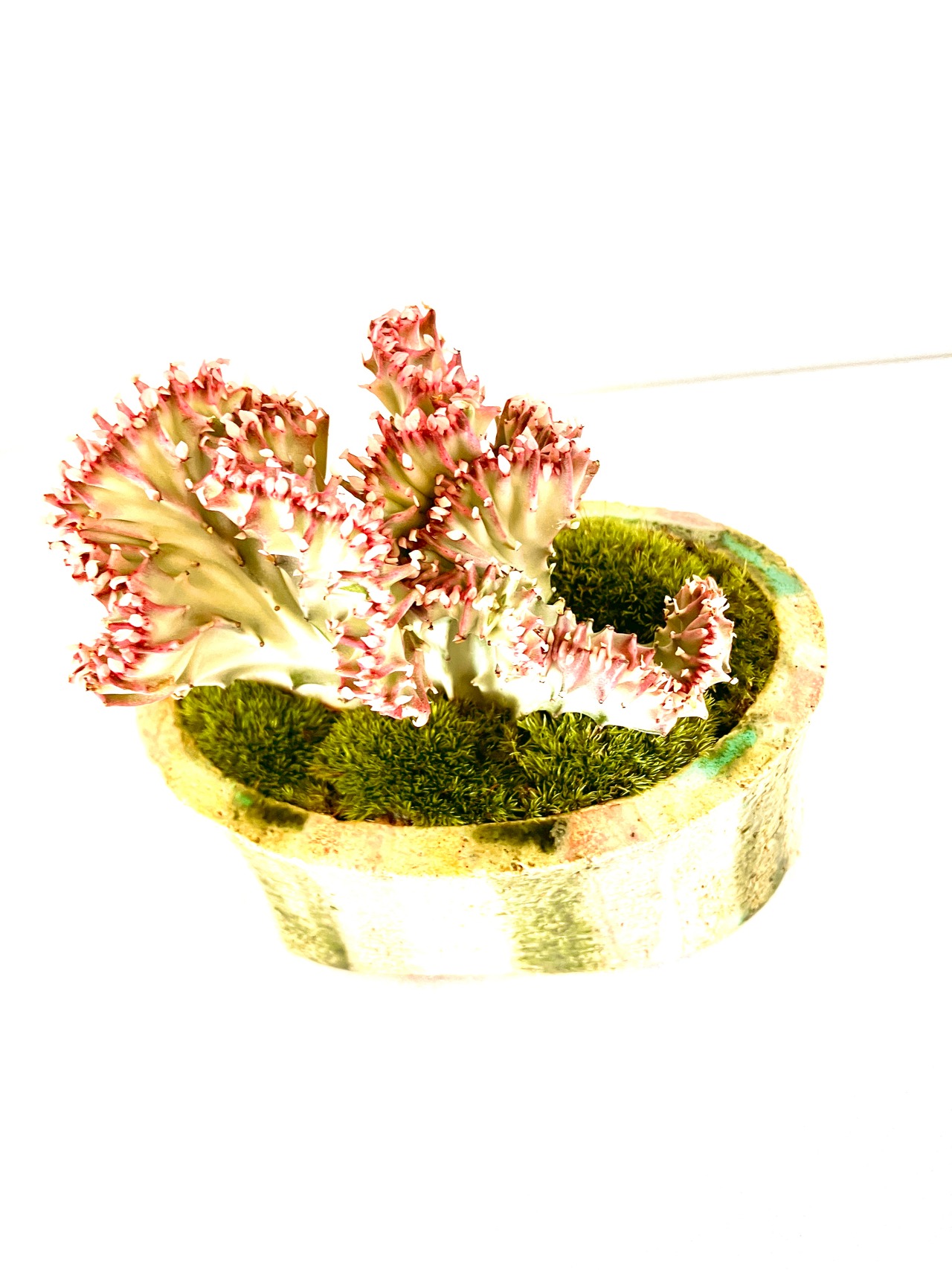 緑の苔が盆栽の土台を包み込み、マハラジャの大きな葉が空間に力強さと高級感を演出します。